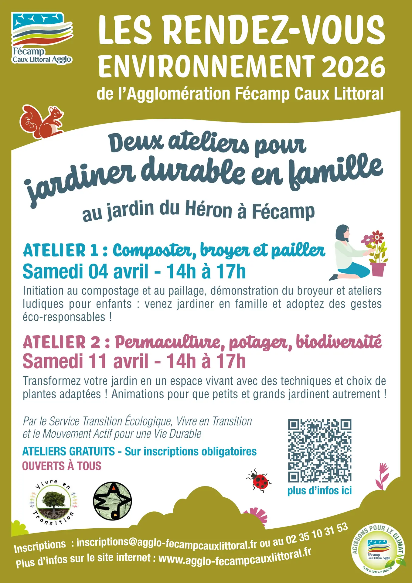 Dans le cadre de ses Rendez-vous Environnement et à l’occasion de la Quinzaine du compostage, l’Agglomération Fécamp Caux Littoral vous propose deux après-midis d’animations autour du jardinage durable. Ils auront lieu au Jardin du Héron, route de Valmont à Fécamp. Pensez à vous inscrire !