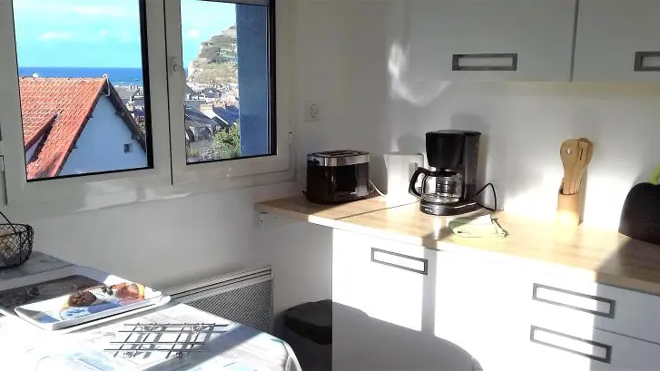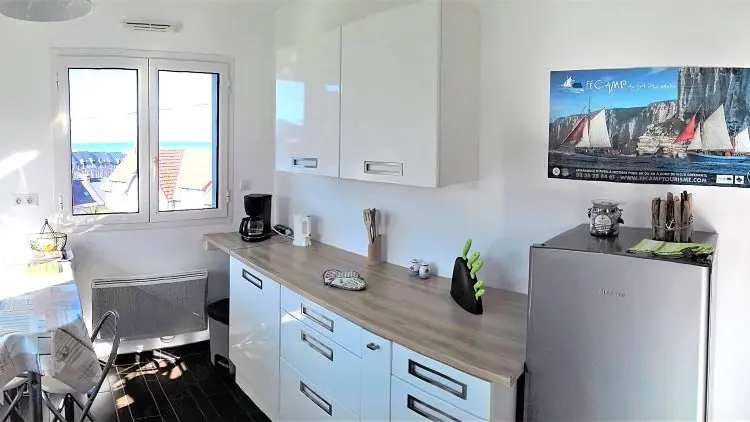 Appartement indépendant avec vue mer et terrasse, idéalement situé à proximité de tous les centres d’intérêt. Lumineux et agréable, il se situe au 1er étage (sans ascenseur) d’une maison moderne de trois étages, sur les coteaux sud de Fécamp.