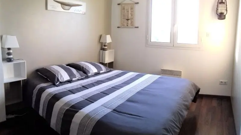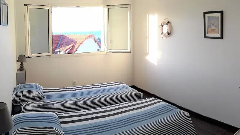 Séjour lumineux avec accès à une terrasse exposée plein sud, cuisine ouverte entièrement équipée avec vue sur la mer. L’appartement comprend deux chambres avec vue mer : une chambre avec un lit de 160 × 200 et une seconde chambre avec deux lits (possibilité de les réunir en un lit de 160 × 200). Salle de bain avec douche et WC.
