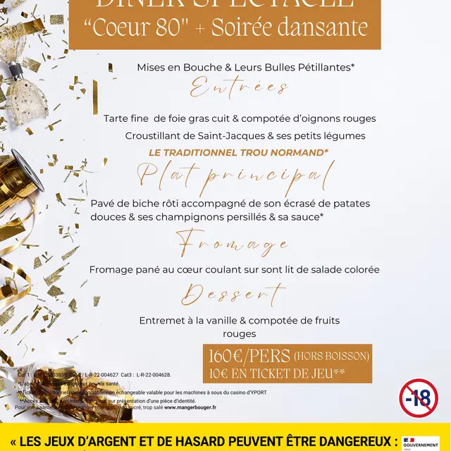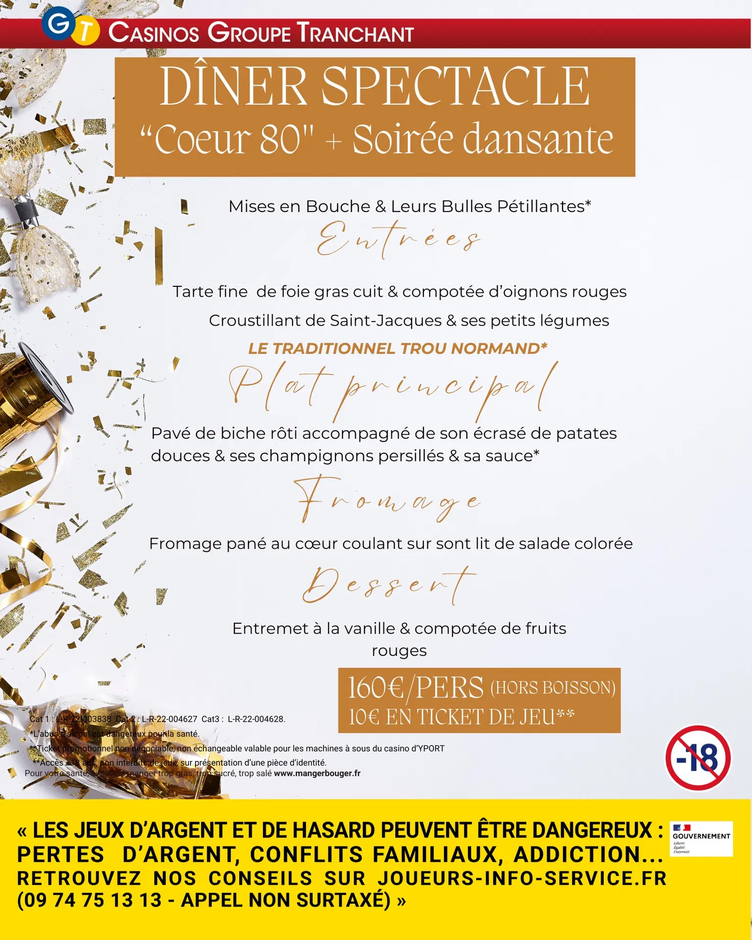 Cette année votre Casino Tranchant - Yport, vous propose son Menu Spectacle spéciale COEUR 80 avec soirée dansante jusqu'à 02h30 !